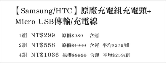 Samsung/HTC-原廠充電組充電頭+Micro USB傳輸/充電線-三星與HTC原廠平行輸入充電組,品質不變價格超優惠!快趁優惠購入最划算!精打細算的您省荷包最佳選擇平均每組最低只要259元起( 售價:259 我要購買